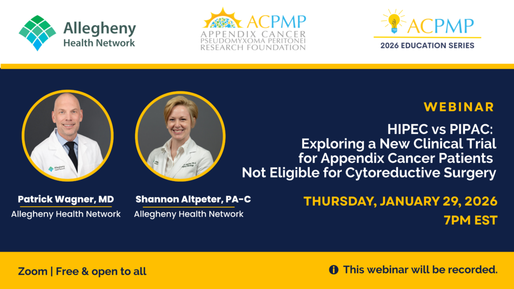 This webinar will introduce CHARLIE’S Trial 2, a clinical study led by Patrick Wagner, MD, and Shannon Altpeter, PA-C, of Allegheny Health Network, that compares two methods of delivering chemotherapy directly into the abdomen: heated intraperitoneal chemotherapy (HIPEC) and pressurized intraperitoneal aerosol chemotherapy (PIPAC).