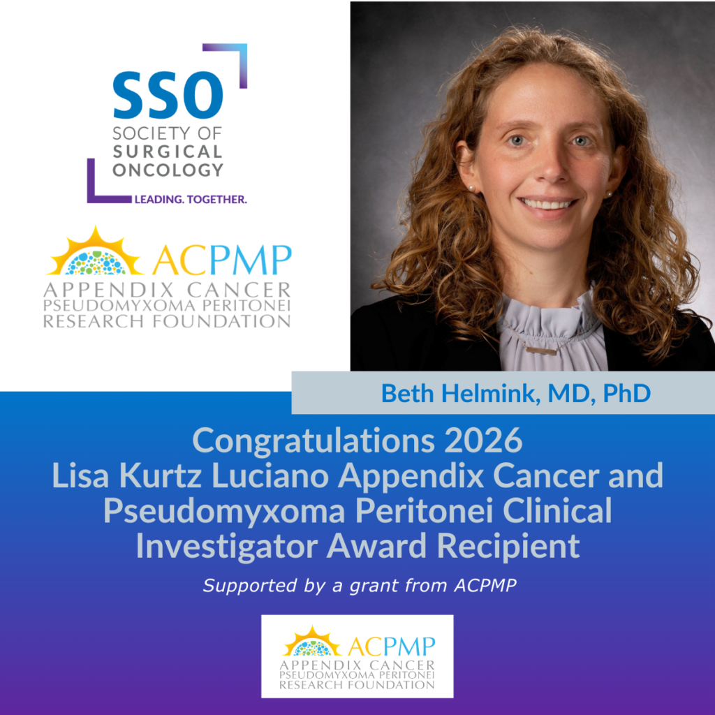 The following researcher received the 2026 $100,000 Lisa Kurtz Luciano Appendix Cancer and PMP Clinical Investigator Award (CIA) funded by The Appendix Cancer PMP Research Foundation and administered by the Society of Surgical Oncology (SSO):